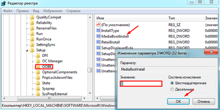 HKEY_LOCAL_MACHINE/Software/Microsoft/Windows/CurrentVersion/Setup/OOBE - Справа найдите параметр "MediaBootInstall".